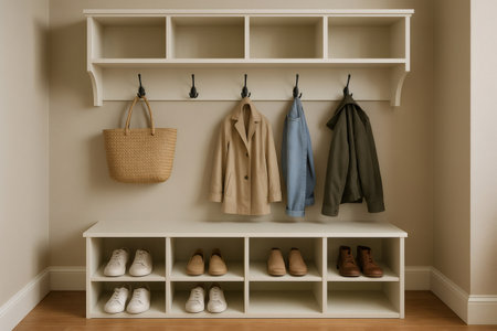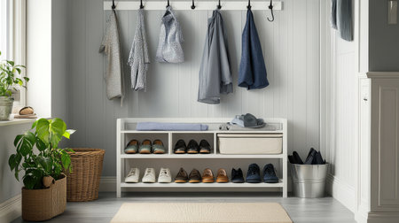 Stylish and functional mudroom furniture providing organized storage space for coats, bags, and shoes, promoting order and efficiency in a home entrance