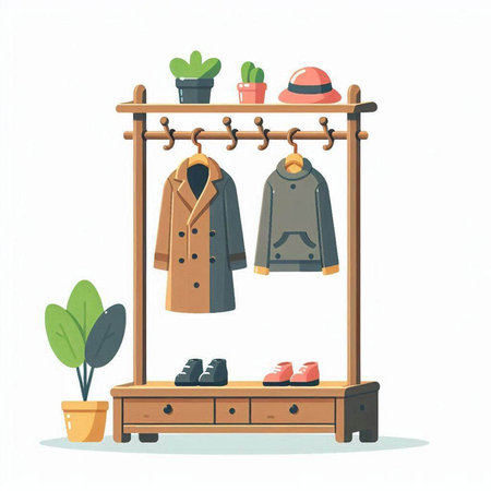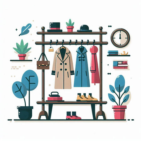 Clothes rack with clothes and accessories. Vector illustration in flat style
