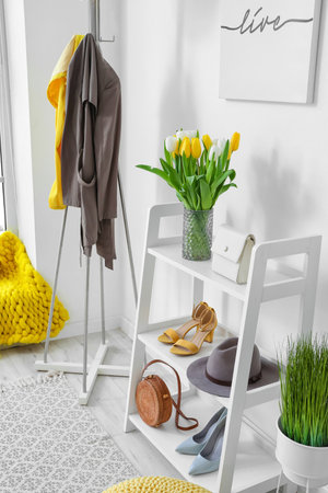 Interior of living room with clothes rack and beautiful blooming branches in vases