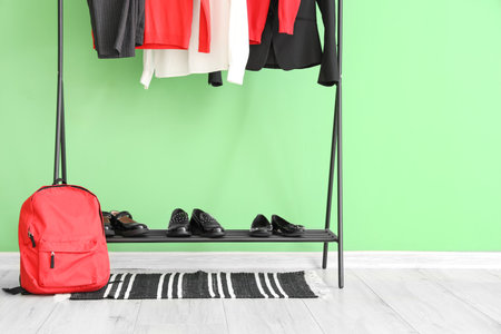 Stylish school uniform hanging on rack, backpack and shoes near green wall in room