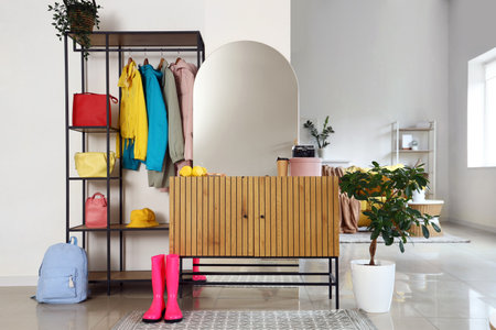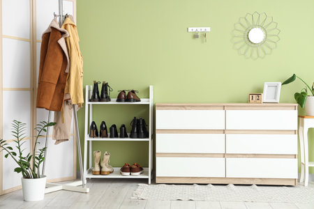 Interior of stylish hall with chest of drawers, shoes stand, rack and key holder on green wall