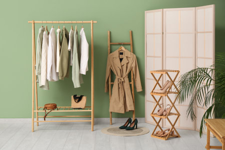 Rack with stylish clothes coat on ladder and folding screen near green wall in room