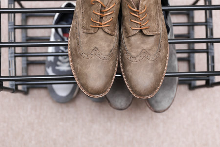a shoe rack is captured in this editorial-style photograph, showcasing its simplicity and cleanliness. the image is set in an empty brutalist environment, creating a minimalist aesthetic. shot with a mamiya rz67 camera, the photograph is zoomed in to highlight the details of the shoe rack. ai generated