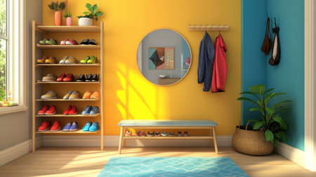 A vibrant entryway showcasing a colorful shoe rack, a stylish round mirror, and a cozy bench, creating a welcoming and organized atmosphere in an inviting home design.