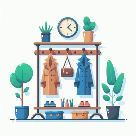 Clothing store concept. Vector flat cartoon illustration with coat, coat, shoes and plants