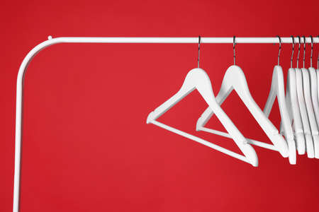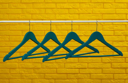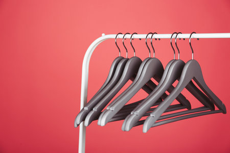 Empty clothes hangers on metal rail against grey background. Rectangular metal clothing rail with empty color wooden coat hangers.
