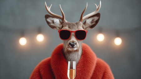 A stylish deer sporting sunglasses holds a champagne glass, donning a cozy red fur coat against a warm-colored background, creating a whimsical atmosphere perfect for celebrations.