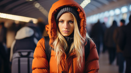 girl with bright puffy jacket posing stock photo, dark turquoise and light orange