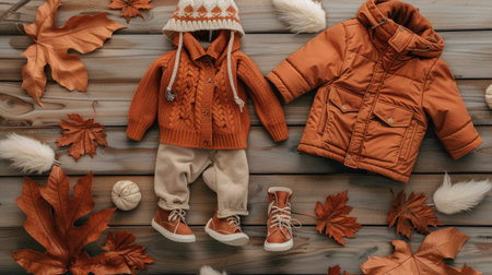 Fashionable children's fall ensemble, terracotta jacket, knitted sweater, trousers, boots, flat lay, top view