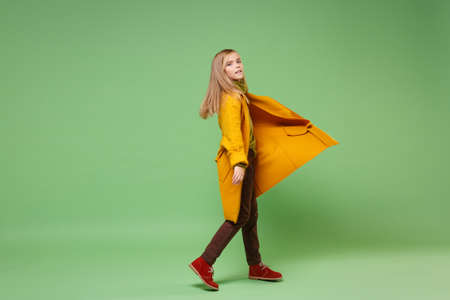 Side view of little blonde kid girl 12-13 years old in yellow coat posing isolated on pastel green background children studio portrait. Childhood lifestyle concept. Mock up copy space. Looking camera.