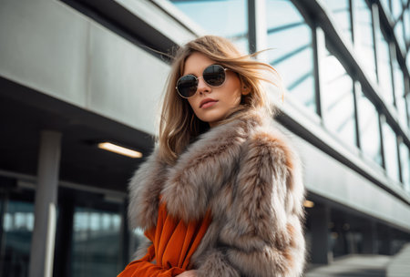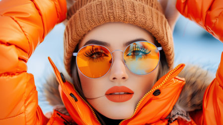 A fashionable young woman poses against a snowy backdrop, showcasing her vibrant orange winter jacket and stylish sunglasses, highlighting her beauty.