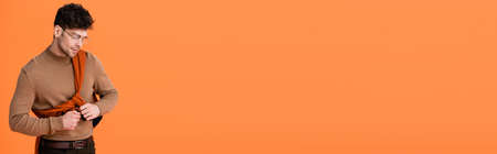 panoramic concept of trendy man in glasses touching jumper and looking away isolated on orange