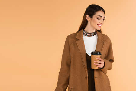 happy woman in stylish coat holding takeaway drink isolated on beige