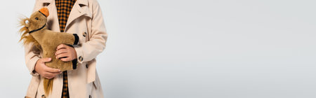 cropped view of girl in stylish trench coat standing with toy horse isolated on grey, banner