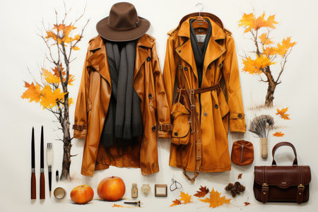 Autumn fashion. Fashionable women's coat, hat, bag, pumpkins, autumn leaves.