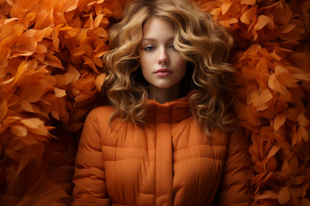 Top view at beautiful woman lying on the ground at autumn, created with generative AI
