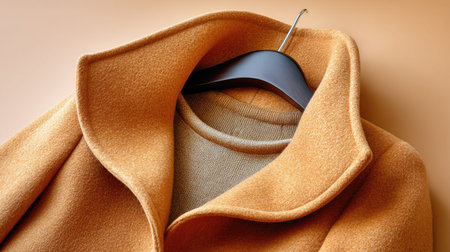 Luxurious brown wool coat with a soft texture hangs elegantly on a black hanger, set against a neutral background, perfect for showcasing modern fashion aesthetics.