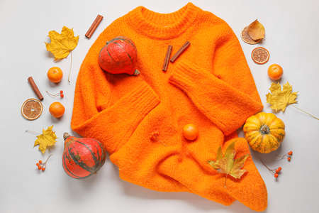 Cozy Orange Sweater and Autumn Leaves on Vibrant Orange Background