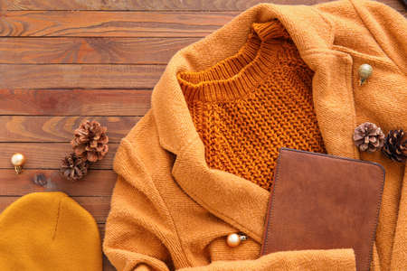 Female elegant yellow cashmere topcoat. Women fashion autumn apparel on white wooden background. Feminine fashion and style.