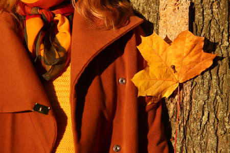 Portrait of pretty Caucasian blonde woman in colorful orange autumn park. Bright stylish woman in hat and coat near tree trunk. Hello fall concept. Blurred yellow maple leaf. Love nature.