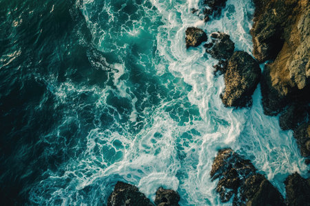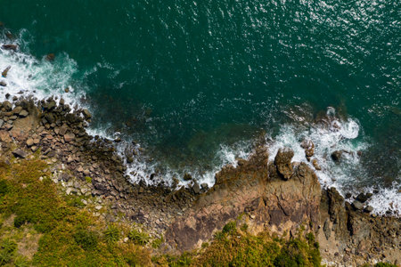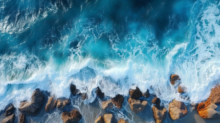 Aerial view of the ocean waves crashing on the rocky shore.