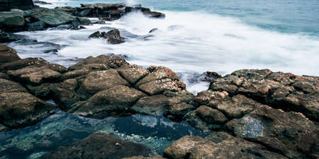 Rocks and waves at Point Cartwright beach in the afternoon. Sunshine Coast, Queensland.
