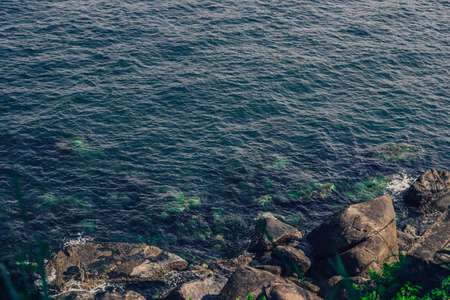 Background shot of aqua tropical sea blue water surface and green algae on rocks under water. Dark toned photo abstract sea ripples natural background. Ideal for design wallpaper