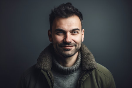 Portrait of a handsome young man in a warm jacket on a dark background.