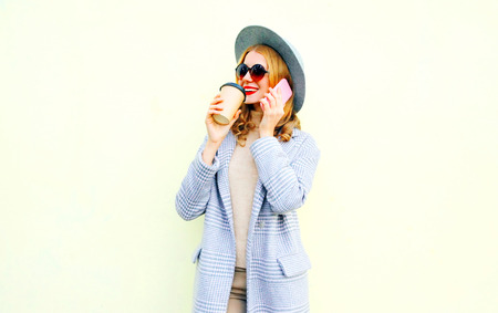Portrait elegant young smiling woman calling on smartphone on city street, wearing coat jacket, round hat on wall background