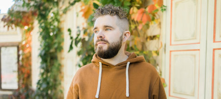 Banner Close up shot of curly European male with beard wears switshot outdoors copy space. Handsome man with crisp light hair.
