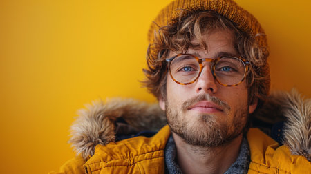 A man with glasses and a hat wearing yellow jacket, AI