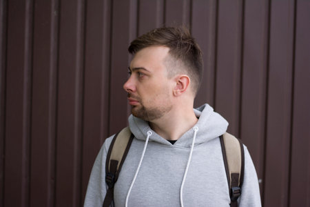 The guy looks to the side against the background of a brown wall