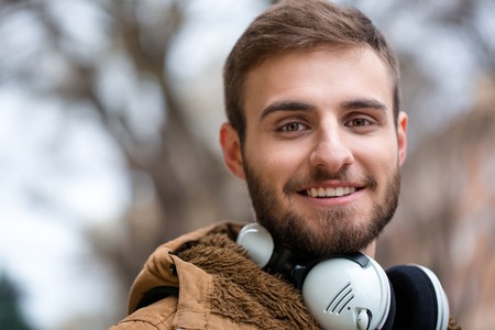 Close up of cheerul attractive bearded young male with headphones on the street