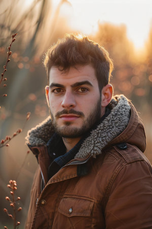 Muslim man headshot portrait looking at camera, wearing winter outfit in outdoors