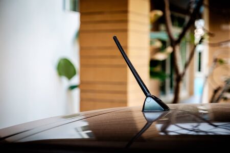 Black plastic car radio attenna on the black roof with nature background