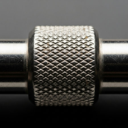 A close-up view of metallic fasteners and threads on industrial machinery showcases intricate details and textures, perfect for engineering and manufacturing themes.