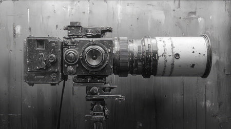 Metallic camera lens repairing in dark workshop with flame background generated by artificial intelligence