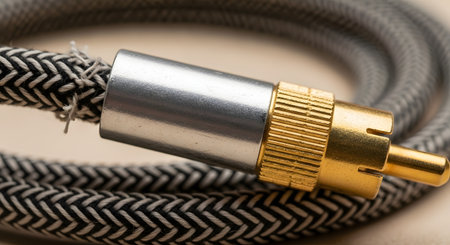 A detailed macro photograph of a gold-plated RCA audio connector attached to a thick, braided black and grey cable. The focus is sharp on the metallic plug, highlighting its texture and the quality of the electronic component. This image represents concepts of audio technology, connectivity, and high-fidelity sound equipment.