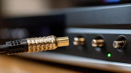 A detailed close-up of an audio equipment connection featuring a gold-plated cable and various buttons on a modern amplifier. Perfect for technology and sound enthusiasts.
