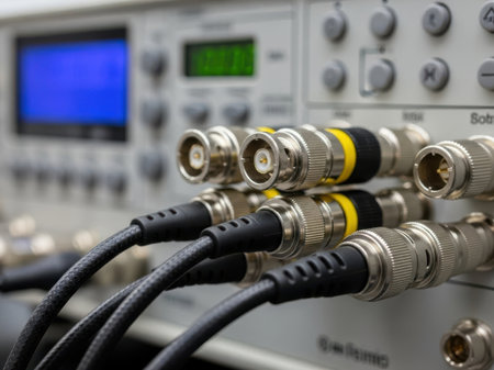 This image showcases detailed industrial cables and connectors, highlighting the intricate design and functionality within technological environments. Perfect for themes of engineering and machinery.