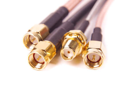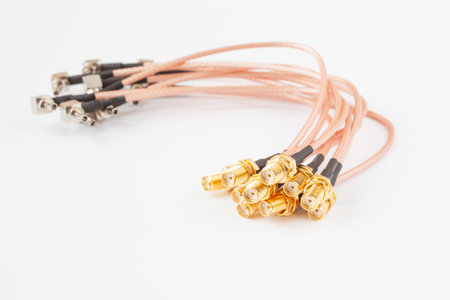 Variety coaxial 50 Ohm RF cables with SMA connectors macro close up