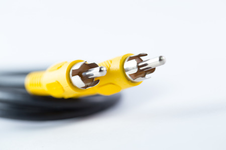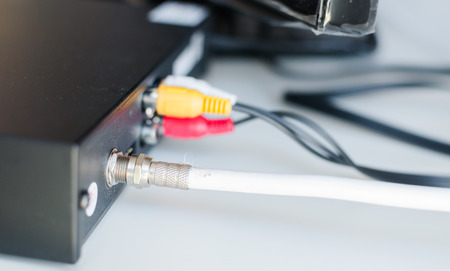 Closeup of coaxial cables used for TV. Electrical cable with an inner conductor and an outer shield, used to carry high frequency electrical signals.