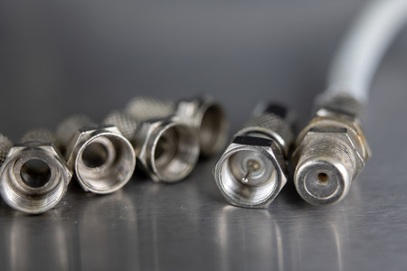 F-type metal connectors for connecting to cable TV. Electronic accessories for repairing a television network. Dark background.