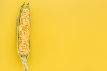 Fresh corn in cob at yellow paper background. Top view. Space for text.