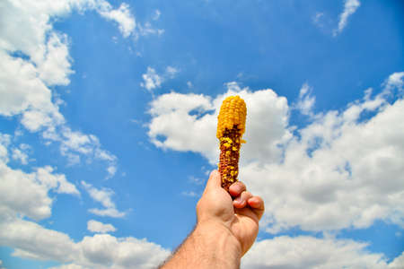 Male hand holds bitten corn against the blue sky with clouds, healthy food concept