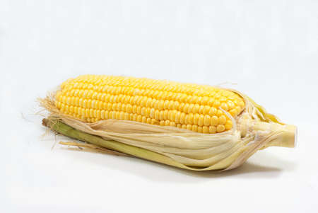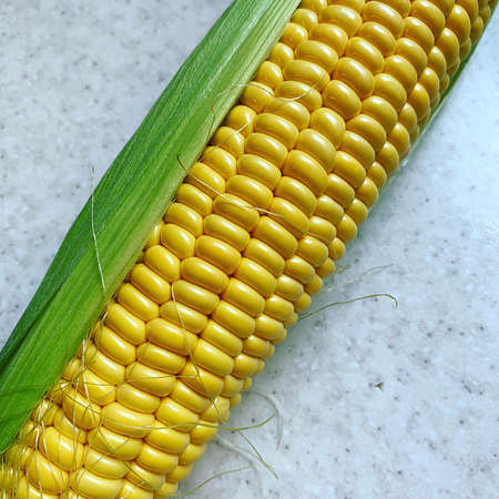 Ripe sweet corn on the cob on a light background. A popular cereal grain close-up.