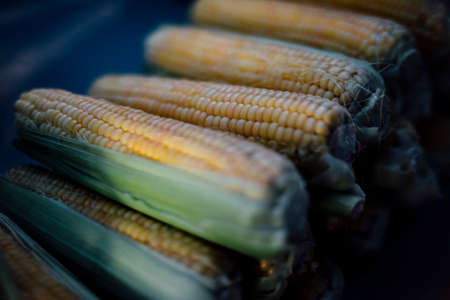 Fresh raw yellow corn in the street market. Organic product suitable for vegeterians and vegans. Healthy food concept background
