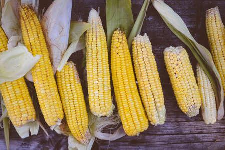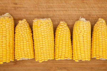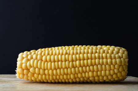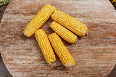 Yellow corn cobs is on the wooden table