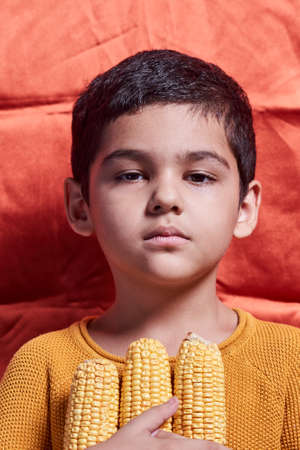 A little boy holds raw corns over orange background