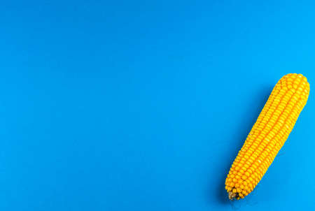 Colorful minimalistic still life of one ripe yellow cob of corn on a bright blue textured background. Vegan healthy food concept. Contrast food background with copy space.